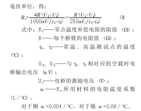 實(shí)踐證明,對(duì)于普通準(zhǔn)確度級(jí)別的稱(chēng)重傳感器,只要彈性元件結(jié)構(gòu)、尺寸、材料、電阻應(yīng)變計(jì)、制造工藝完全一樣,可以采用由抽樣方法經(jīng)過(guò)試驗(yàn)取得靈敏度溫度補(bǔ)償電阻最佳值進(jìn)行補(bǔ)償,而不必逐一反復(fù)測(cè)試調(diào)整。對(duì)于高準(zhǔn)確度稱(chēng)重傳感器和在工作溫度變化大 (例如-15℃~50℃)的環(huán)境下工作的稱(chēng)重傳感器,為了得到較高的補(bǔ)償精度,使其在工作溫度范圍內(nèi)具有較小的靈敏度溫度誤差,必須逐個(gè)進(jìn)行測(cè)試調(diào)整。此時(shí)焊入稱(chēng)重傳感供橋電路的靈敏度溫度補(bǔ)償電阻 RMt應(yīng)比理論計(jì)算值大 10%~15%,為過(guò)補(bǔ)償。然后在其上并聯(lián)一個(gè)高精度、低溫度系數(shù)的金屬膜電阻 RP,來(lái)改善 RMt的非線性,通常稱(chēng)為靈敏度溫度補(bǔ)償?shù)木€性化調(diào)整電阻。進(jìn)行補(bǔ)償時(shí),可用精密電阻箱代替線性化調(diào)整電阻便于精密調(diào)整,待求得最佳調(diào)整電阻值時(shí)再用金屬膜電阻替換。必須強(qiáng)調(diào)指出,補(bǔ)償測(cè)試溫度點(diǎn)至少應(yīng)選取三點(diǎn),即最高工作溫度、最低工作溫度和常溫,而不易只選取常溫和最高工作溫度兩個(gè)點(diǎn),這是因?yàn)殪`敏度溫度補(bǔ)償鎳電阻與溫度不成線性關(guān)系。