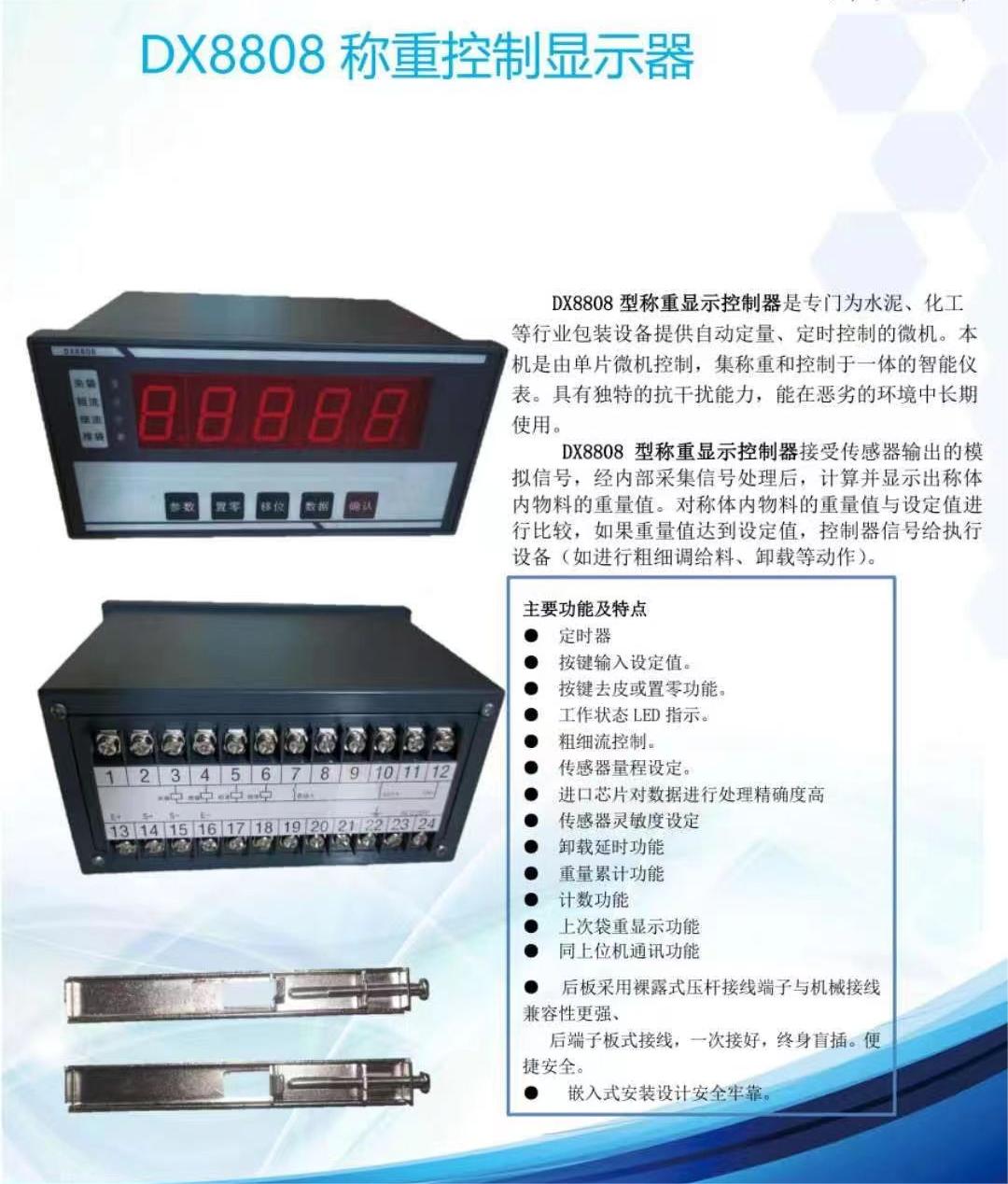 jlz廣州南創(chuàng)電子科技有限公司DX8808稱重控制顯示器介紹:jlz廣州南創(chuàng)電子科技有限公司DX8808型稱重顯示控制器是專門為水泥、化工等行業(yè)包裝設(shè)備提供自動定量、定時控制的微機。本機是由單片微機控制,集稱重和控制于一體的智能儀表。具有獨特的抗干擾能力,能在惡劣的環(huán)境中長期使用。