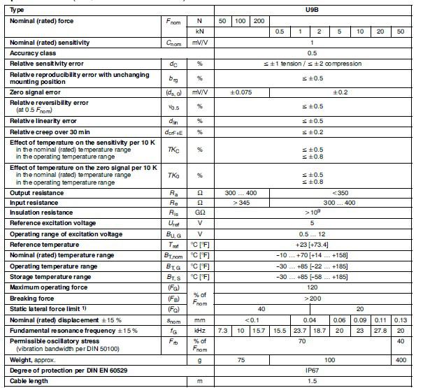 德國(guó)HBM 稱重傳感器U9B/20KN技術(shù)指標(biāo):