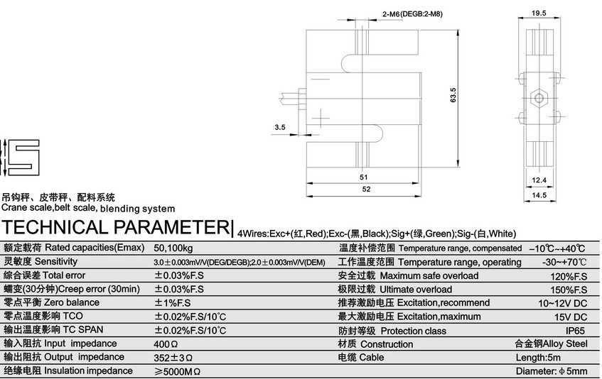 DEGB-100KG稱重傳感器安全過(guò)載能力:150%;