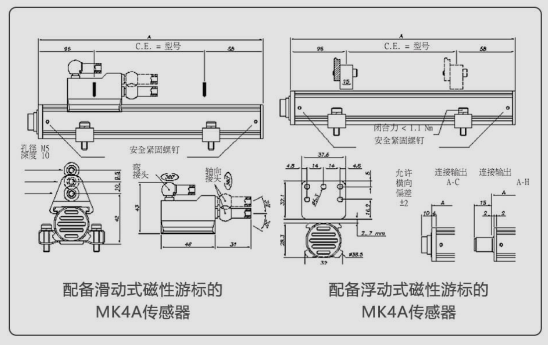 U2r廣州南創(chuàng)電子科技有限公司杰佛倫磁致伸縮位移傳感器MK4-A-A-1000-N MK4-A-B-150-E相關(guān)特點(diǎn): U2r廣州南創(chuàng)電子科技有限公司MK4系列磁致伸縮位移傳感器采用磁致伸縮技術(shù)的非接觸式線性位置傳感器。游標(biāo)上不存在電觸點(diǎn),因此不會(huì)發(fā)生磨損,使用壽命幾乎是無限長。小巧緊湊,易于安裝。完全不受外部介質(zhì)影響,可用在高污染和粉塵較大的惡劣環(huán)境中。出色的線性度,重復(fù)性好,耐機(jī)械振動(dòng)和沖擊。主要特點(diǎn):絕對(duì)測量傳感器;非接觸式傳感器,使用壽命更長;行程范圍:50 - 4,000mm;通過不銹鋼接頭快速插接;滑動(dòng)式或浮動(dòng)式磁性游標(biāo);游標(biāo)位置: 單或雙(最短距離 75mm);工作溫度: -30 - +75°C;耐振 (DIN IEC68T2/6 12g);防護(hù)等級(jí):IP67;電磁兼容性認(rèn)證 CE (EN 50081-2 50082-1);電源 24Vdc ± 20%;內(nèi)部結(jié)構(gòu)經(jīng)過改進(jìn),帶有安全緊固螺釘。