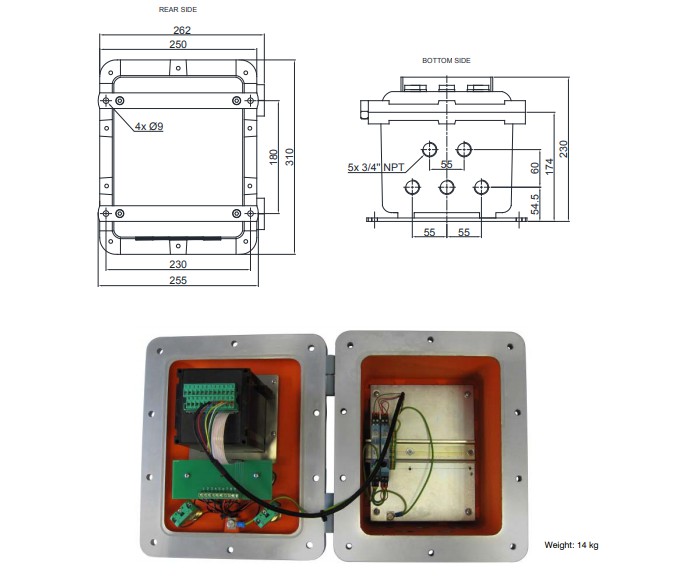 防爆箱,已通過ATEX II 2(1)GD認(rèn)證,配有耐熱透明鋼化玻璃窗和5個(gè)外部按鈕,其功能與W200鍵盤相同