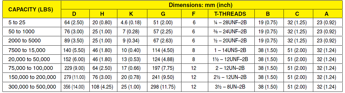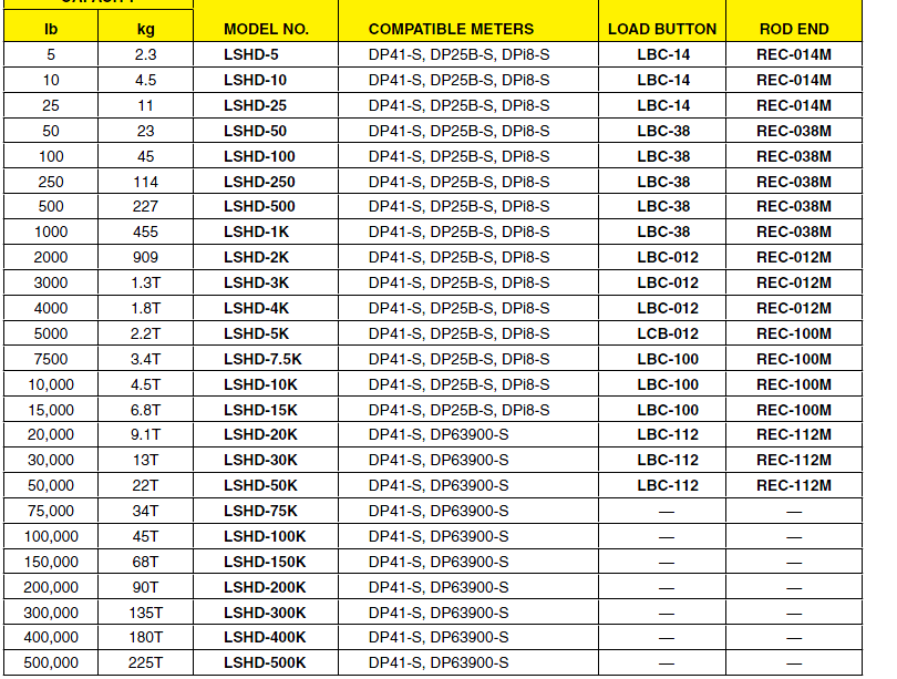 lb kg MODEL NO. COMPATIBLE METERS LOAD BUTTON ROD END