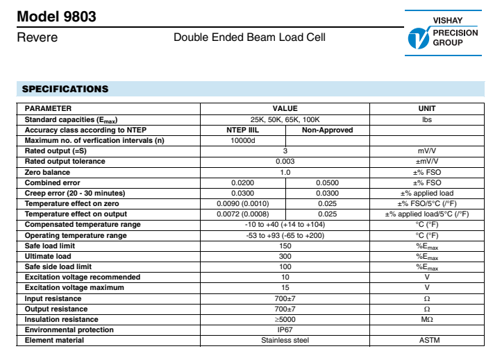 vishay Revere 9803-65klbs稱重傳感器型號類別技術參數選型安裝等資料信息,如果有關
