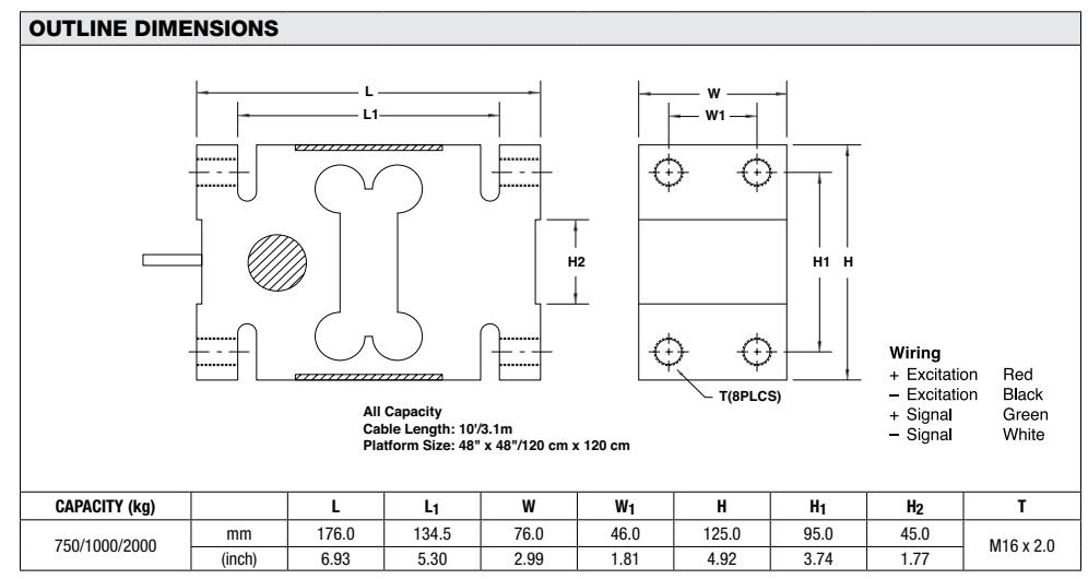 美國威士世銓HOC-750kg稱重傳感器有3個量程可選,分別是HOC-750kg、HOC-1000kg、HOC-2000kg,主要應用于大量程平臺秤、包裝機、灌裝秤、煤炭輸送機秤等方面稱重測量,其尺寸圖如下: