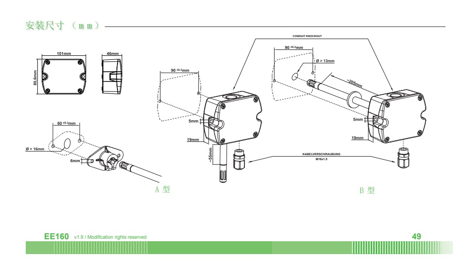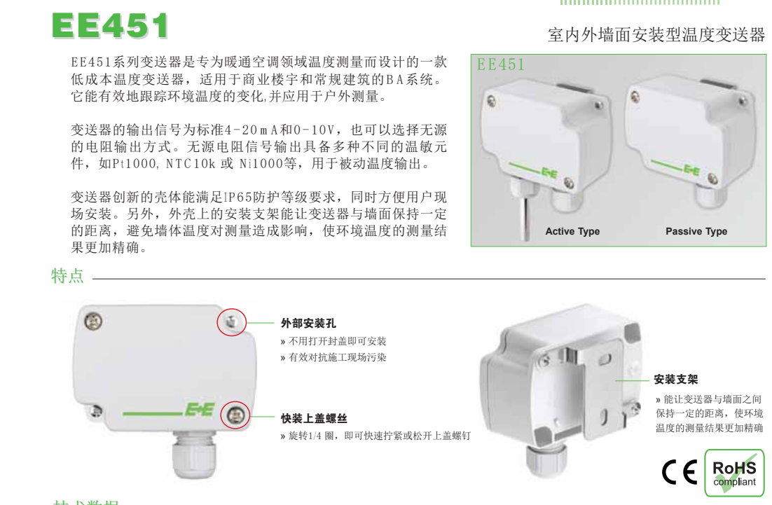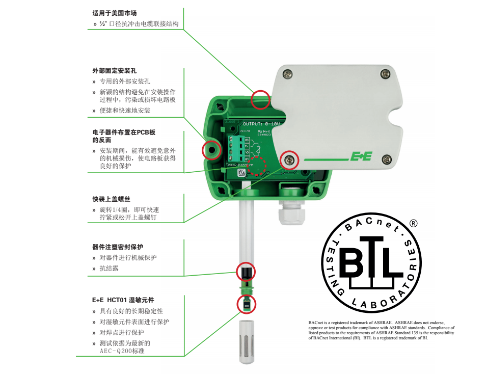奧地利E+E全系列溫濕度傳感器,ee451系列溫濕度變送器是由奧地利益加義公司專為HVAC系統(tǒng)設計開發(fā)的全新系列產品。ee451系列變送器具有高精度、低成本的特性,是測量空氣相對濕度和溫度的理想儀表,能為用戶提供可靠的溫濕度測量解決方案。優(yōu)秀的品質及全新設計的產品外殼,最大程度地降低了安裝成本,減少了現場的工作量,提升了產品抗污染、抗凝結的性能,從而保證其在工作過程中將誤差降低到最小程度。ee451系列產品采用了最新的E+E生產的HCT01敏感元件,具備更好的長期 ee451 穩(wěn)定性和抗污能力。結合了多年的校準經驗,ee451的測量精度可以達到±2.5%RH,具有電流(mA)、電壓(V)和數字通訊三種信號輸出方式?,F場安裝分為墻面安裝和風管安裝兩種方式。