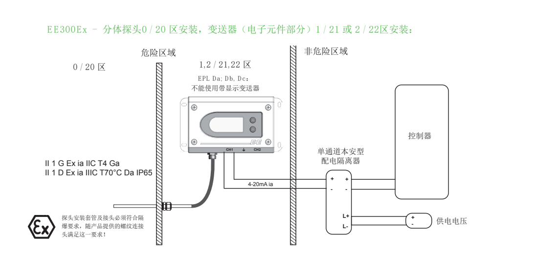 ee300EX溫濕度顯示器探頭均可安裝在易燃易爆危險(xiǎn)區(qū)域其電氣連接采用標(biāo)準(zhǔn)兩線制信號(hào),可以通過(guò)雙通道本安型配電隔離器或齊納安全柵為變送器供電,測(cè)量信號(hào)通過(guò)兩路4~20mA的模擬通道輸出。除了輸出相對(duì)濕度和溫度信號(hào)。測(cè)重全氣中的度,3x也能用測(cè)分,可以m相[aw]輸出。典型應(yīng)用包括:海上石油鉆井平臺(tái)的油品劣化測(cè)量,以及變壓器油、潤(rùn)滑油、液壓油的在線監(jiān)測(cè)。